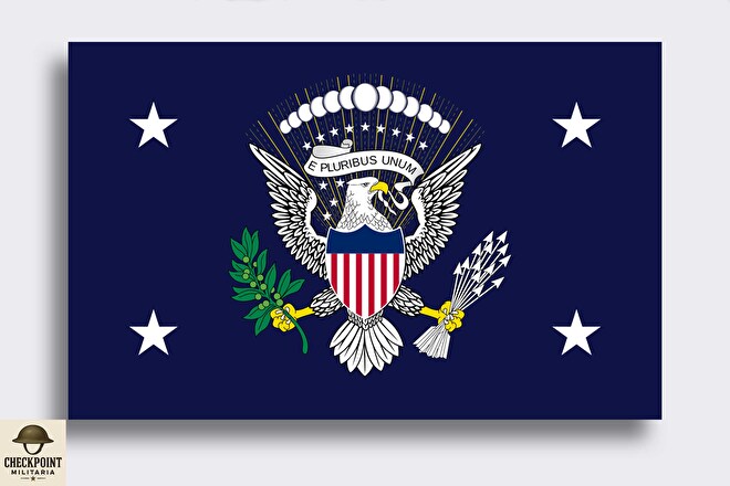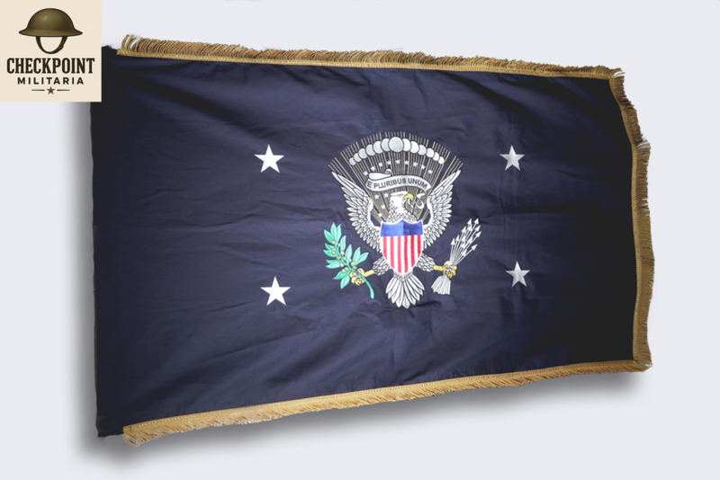 Size: 93 x 150 cm, with gold fringe, sewn stars and embroidered presidential coat of arms. This presidential standard was introduced by President Wilson in 1916 and altered by President Truman in 1945, and used throughout the terms of Presidents Harding, Coolidge, Hoover, and Franklin Delano Roosevelt. The president's flag is typically displayed in the Oval Office and in official photographs, flown on the president's motorcade and at certain presidential appearances, and also used in the funeral processions of former presidents.