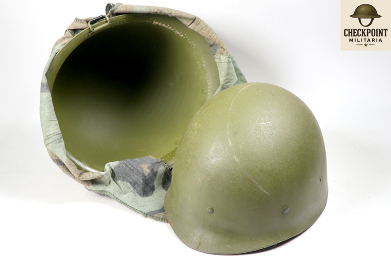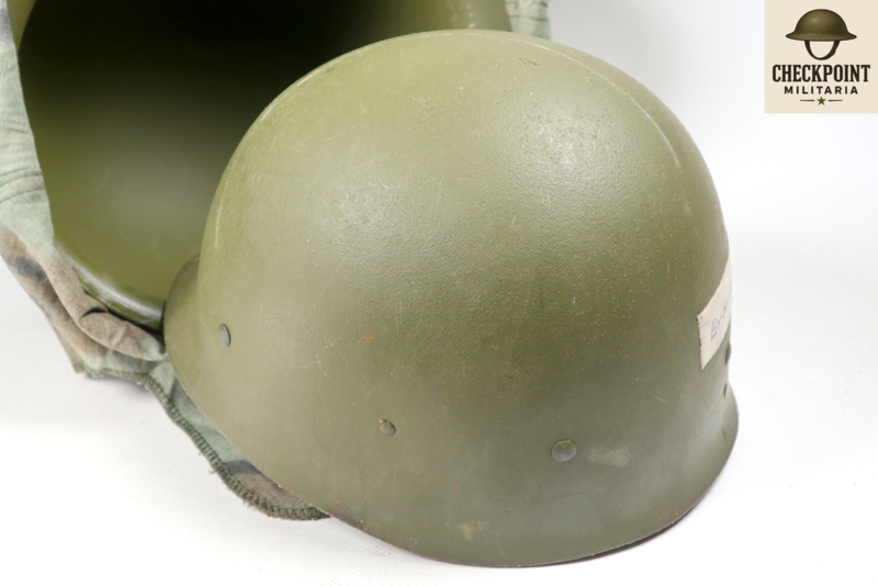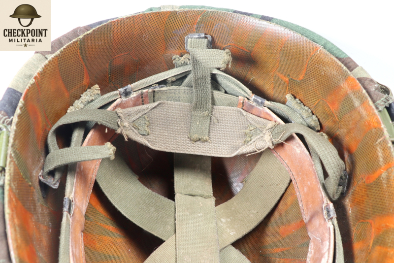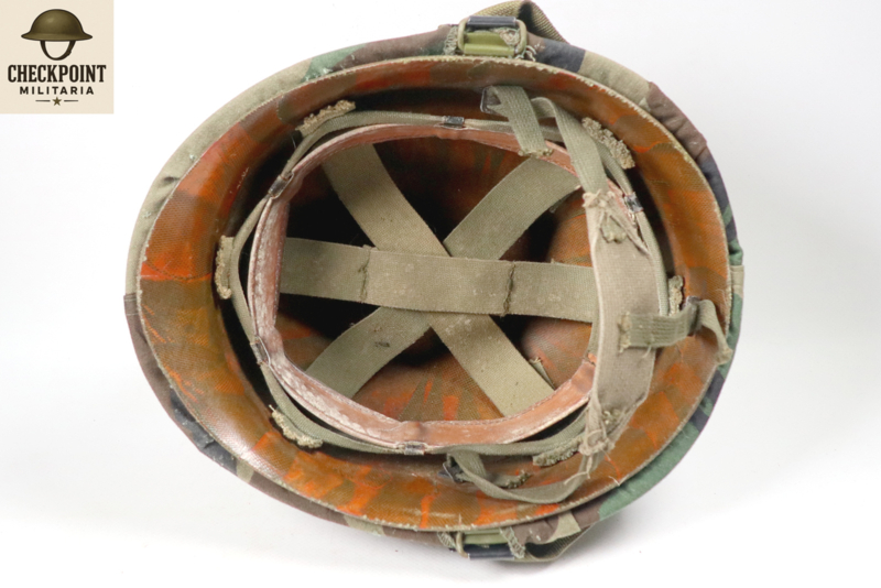 - Details: De overtrek werd vastgezet door flappen tussen de buitenpot en de binnenhelm (liner) te klemmen en was voorzien van gleuven voor het insteken van natuurlijke camouflage.