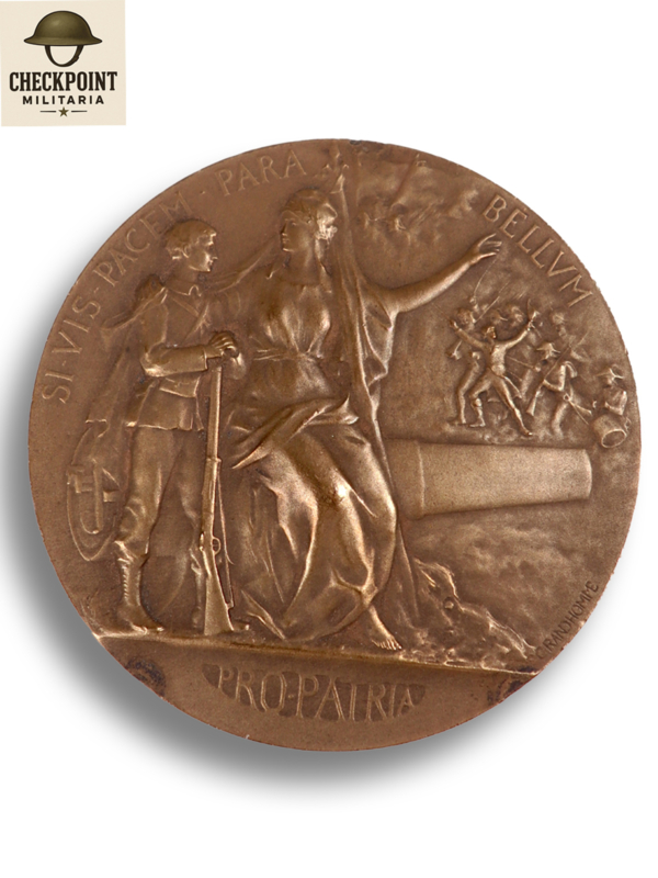 - Voorzijde: Een allegorische vrouwenfiguur (Marianne/Frankrijk) zit op een kanon en bemoedigt een jonge soldaat. Ze wijst naar een veldslag in de verte. Tekst: "SI VIS PACEM PARA BELLVM" en "PRO-PATRIA".