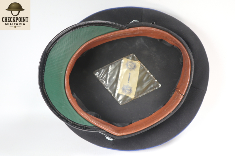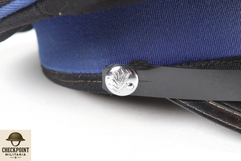 - Kleur & Materiaal: De pet was uitgevoerd in een diep donkerblauwe (bijna zwarte) wol en lichtblauwe petband.