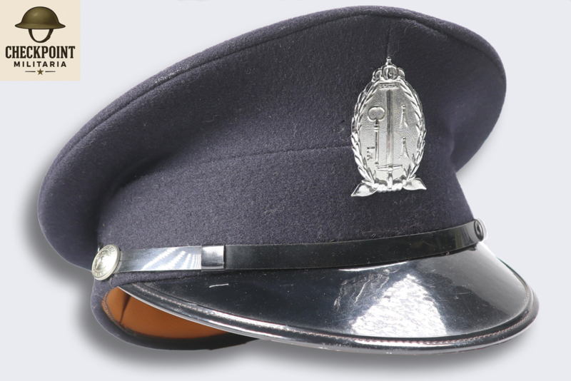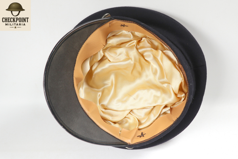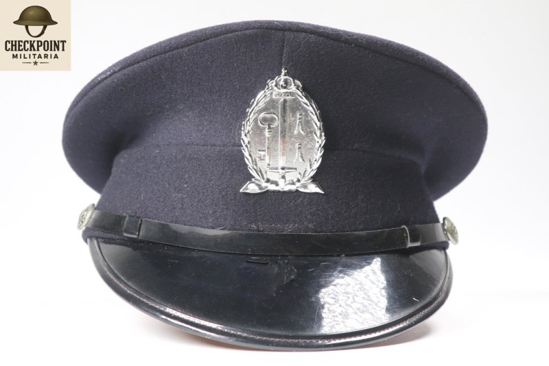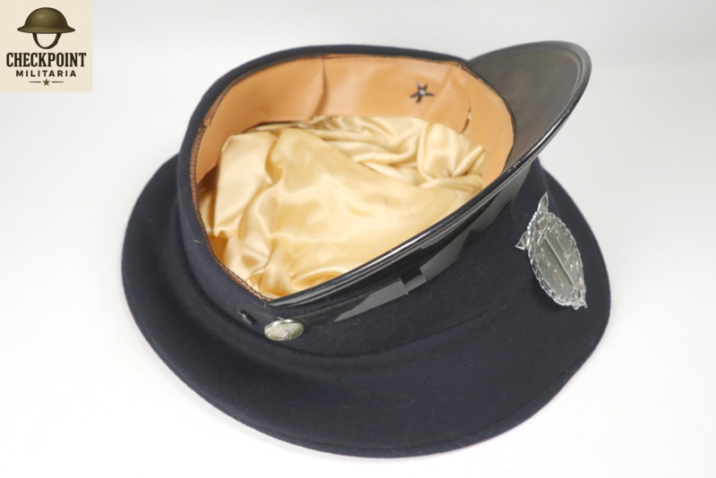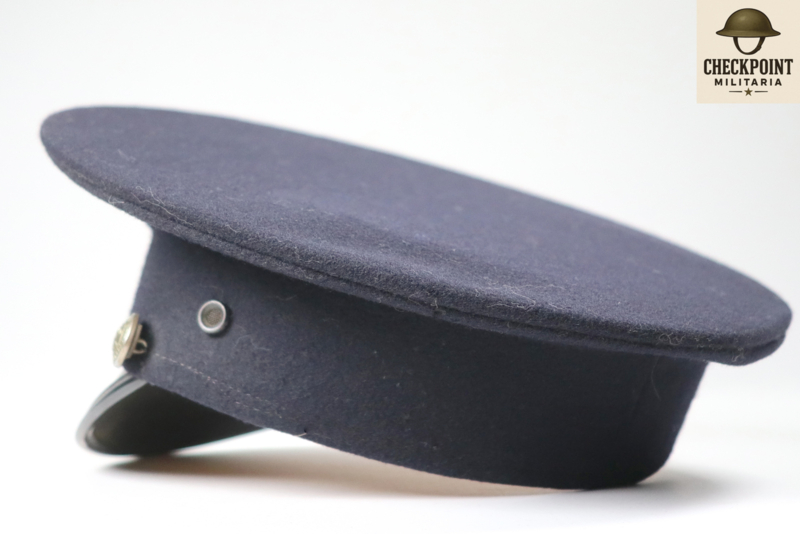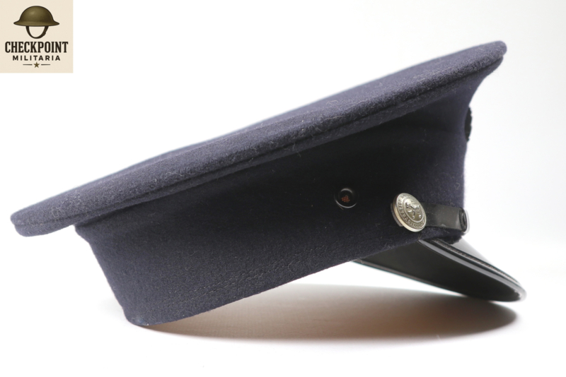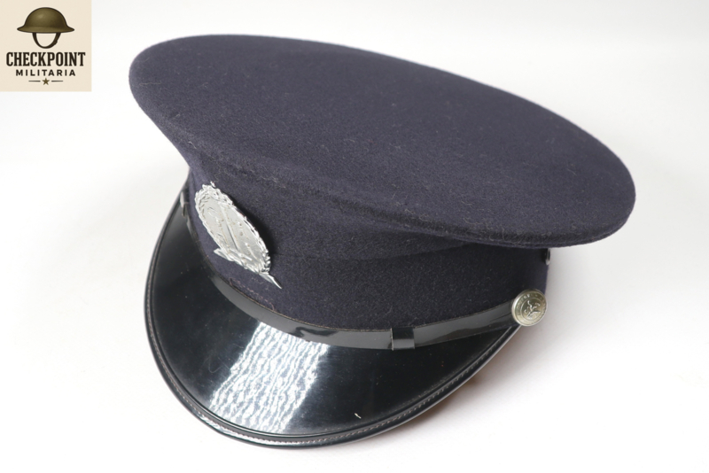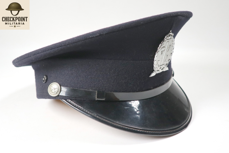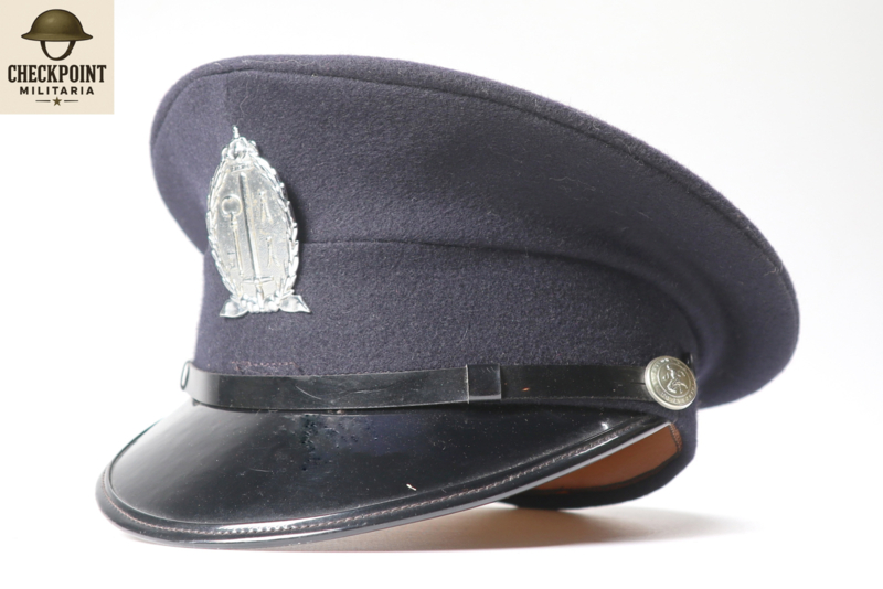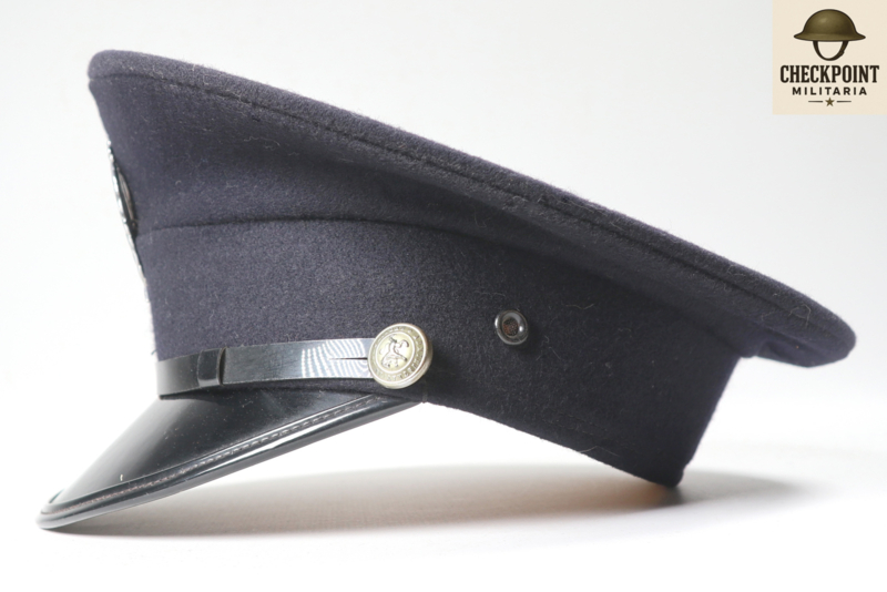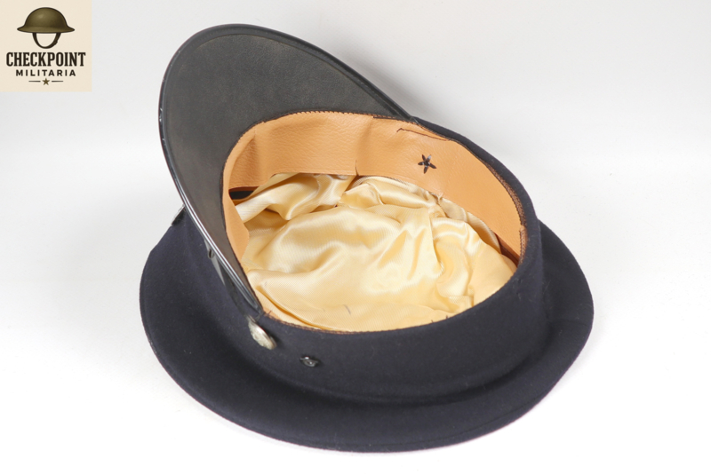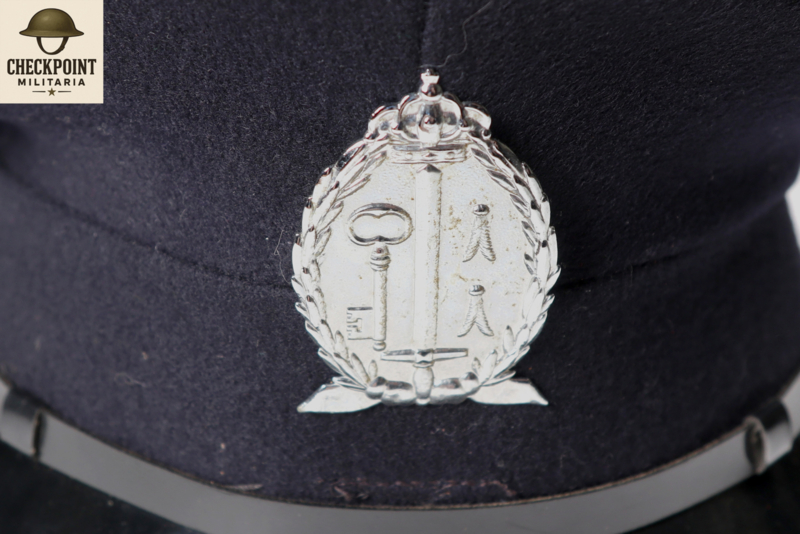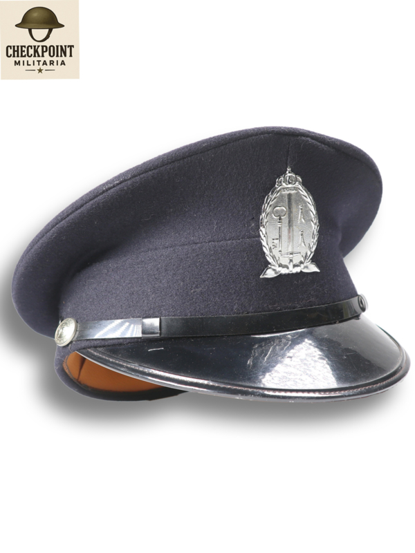 - Model: Het betreft een klassieke platte pet (visor cap), vaak uitgevoerd in een donkerblauwe of zwarte kleur die aansluit bij de rest van het korpsuniform.