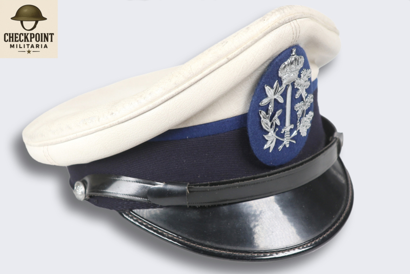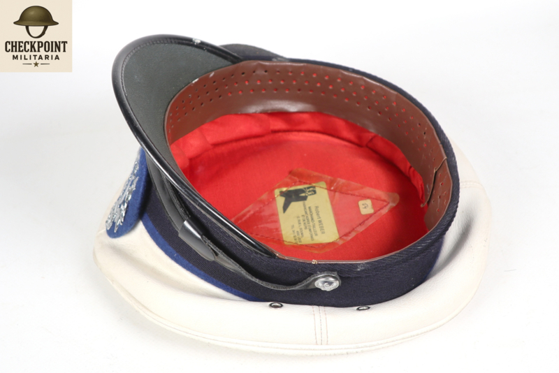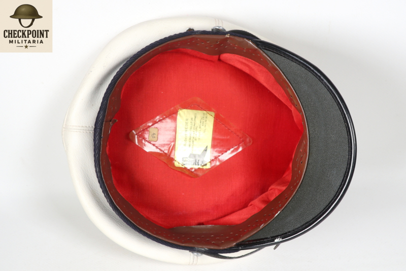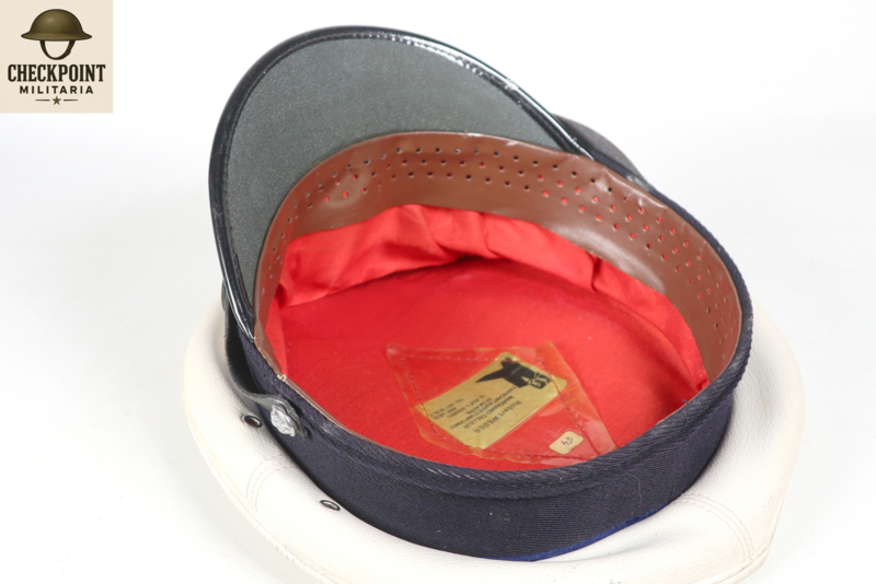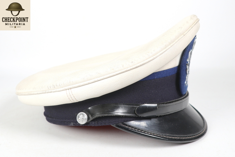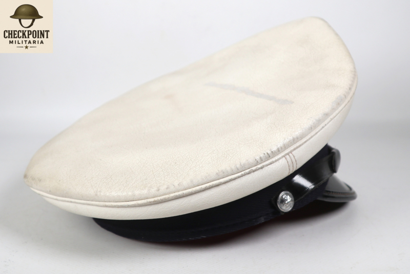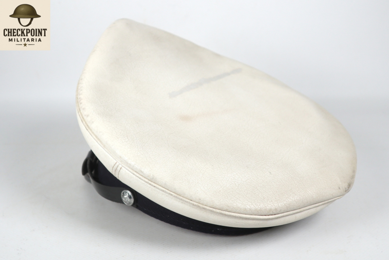 - Materiaal: De bovenkant is bekleed met een strakgespannen wit materiaal dat niet bedoeld is om verwijderd te worden. Dit maakte de pet weersbestendig en gemakkelijker schoon te maken met een vochtige doek, wat essentieel was voor agenten die de hele dag in het verkeer stonden.