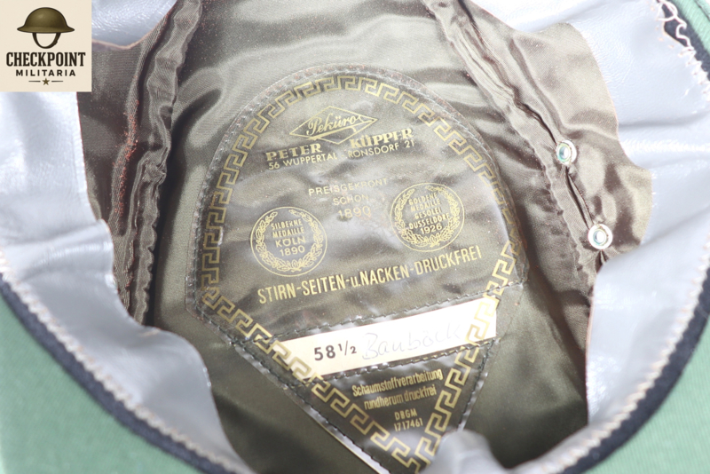 - Materiaal & Kleur: Vervaardigd uit wol in de kleur politiegroen. Historische modellen zijn vaak gestempeld door fabrikanten zoals de Bayerische Mützenfabrik München en Peter Küpper Wuppertal.