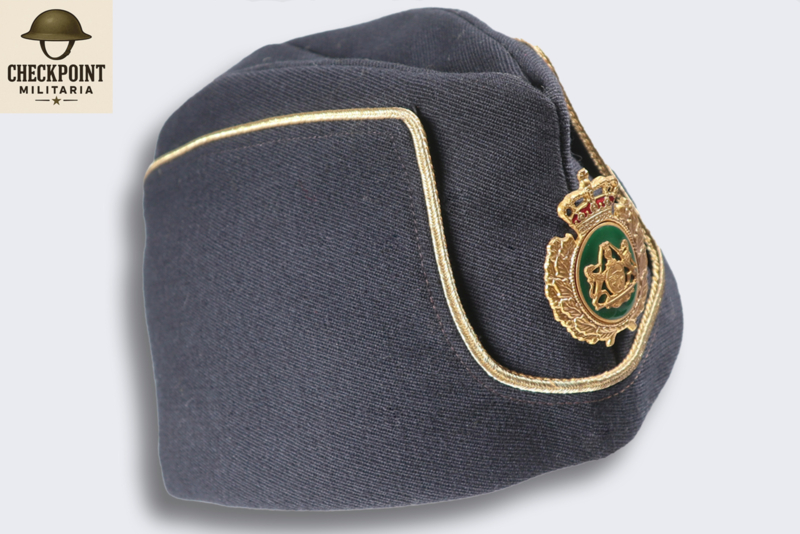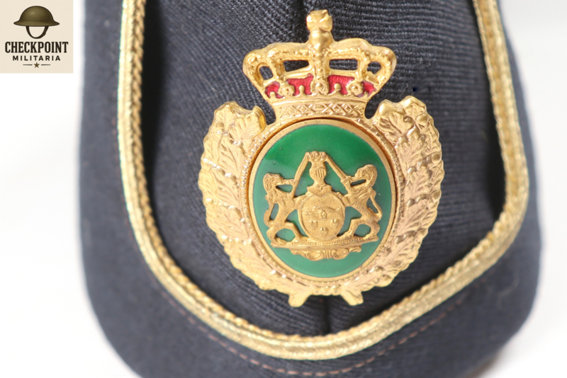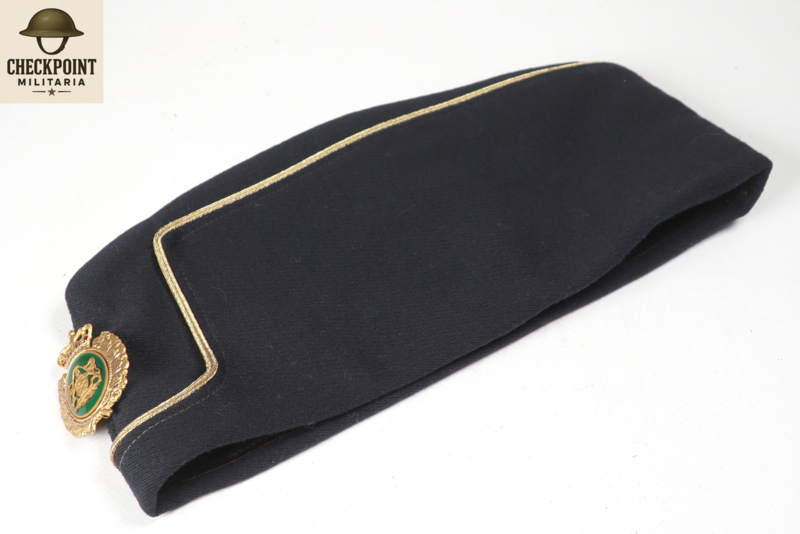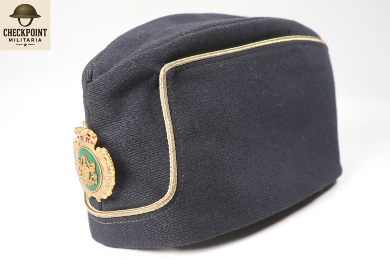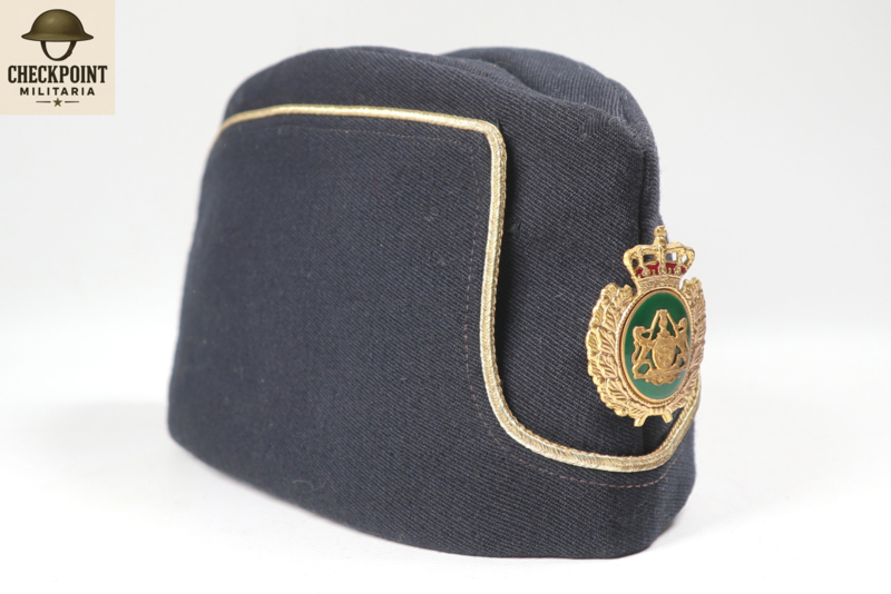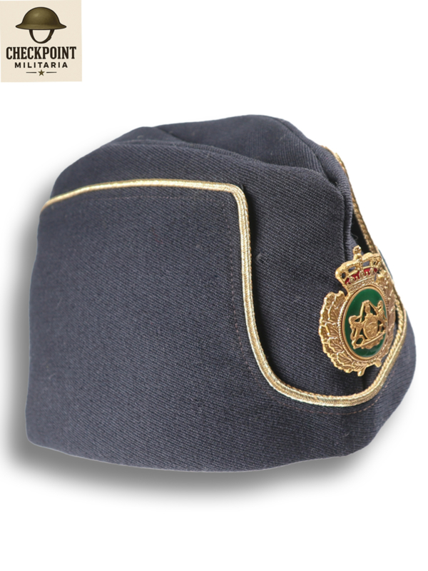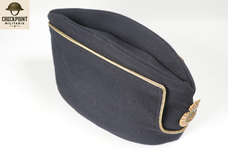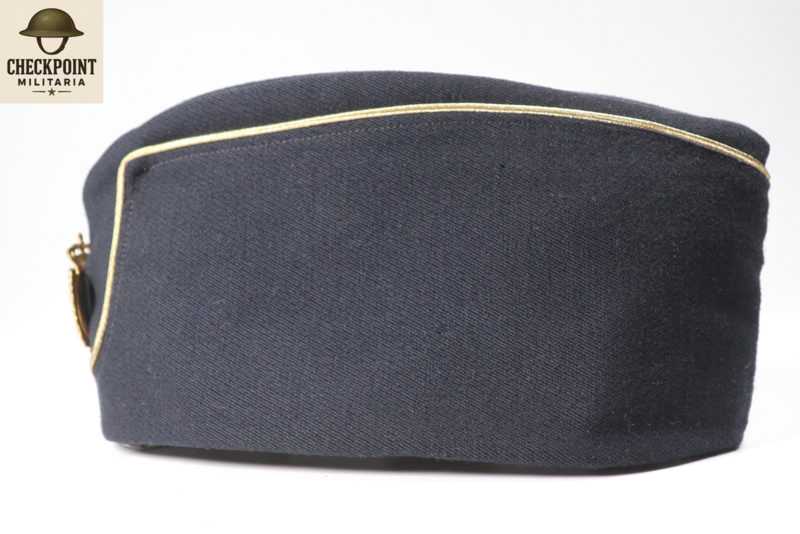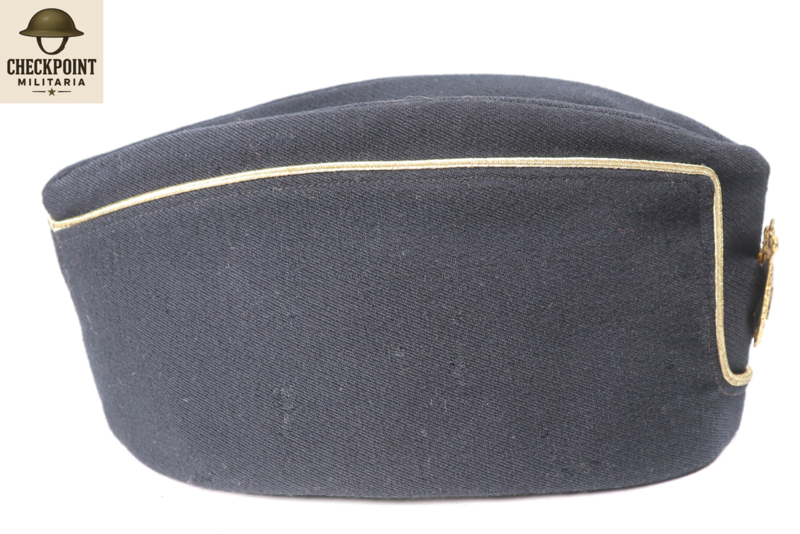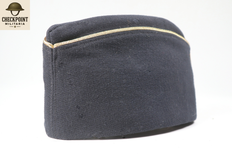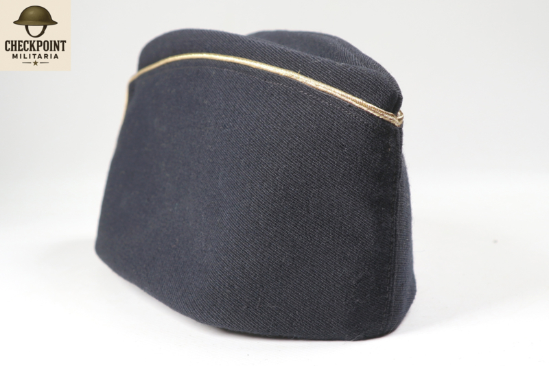 - Ontwerp: Een opvouwbaar model (side cap) uitgevoerd in donkerblauw wol of een vergelijkbaar textiel, vaak voorzien van goudkleurige of zilverkleurige biezen (piping) afhankelijk van de rang.