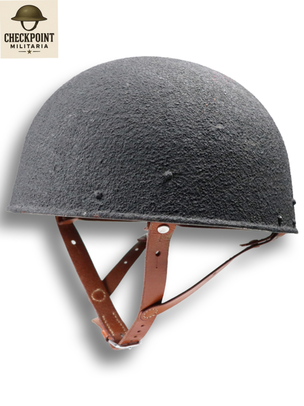 - Kinband: De helm is uitgerust met een stevige, vier punts lederen kinband die met een eenvoudige gesp wordt vastgezet om de helm stabiel op het hoofd te houden tijdens actie.