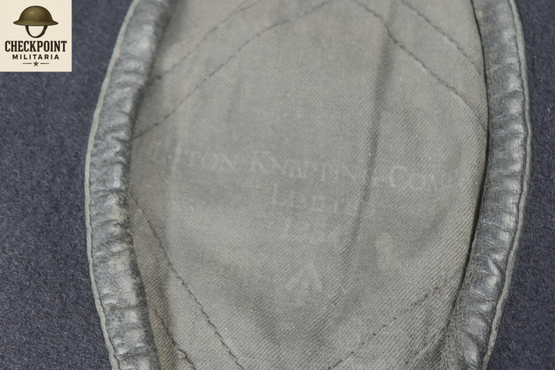 - Identification : L'intérieur est généralement estampillé en blanc ou en argent de la mention « Luton Knitting Co Ltd », souvent accompagnée de l'année (par exemple, 1954) et de la flèche large du ministère britannique de la Défense. Insigne de casquette