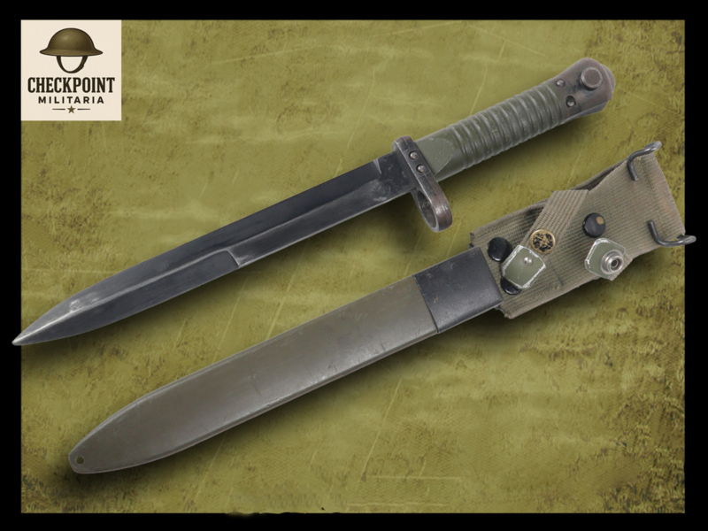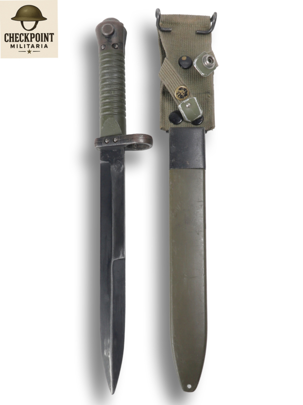 - Fourreau : Le fourreau fourni est en plastique vert avec un embout buccal en métal et un porte-baïonnette intégré en tissu (grenouillère) muni d'un crochet métallique.