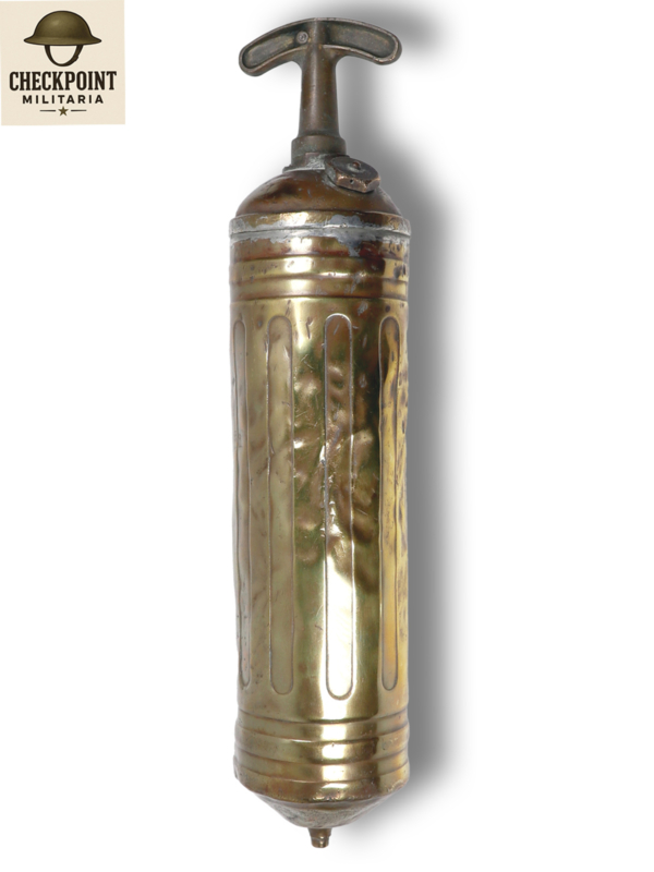 L'extincteur manuel Pyrene des années 1940 est une pièce emblématique du design industriel, célèbre pour son utilisation dans les véhicules et avions militaires durant la Seconde Guerre mondiale. Aujourd'hui, ces extincteurs sont des objets de collection très prisés en raison de leur finition en cuivre ou en chrome.